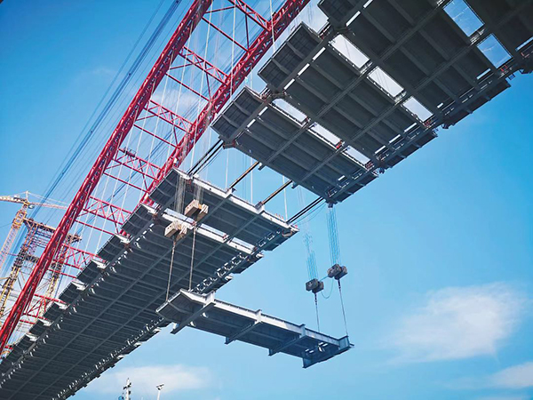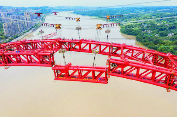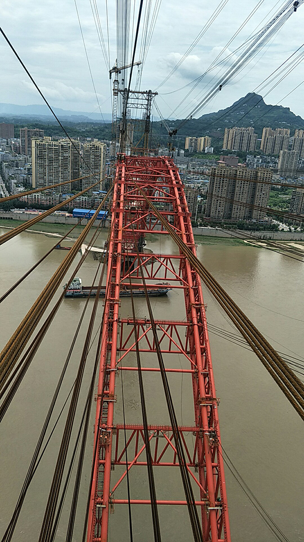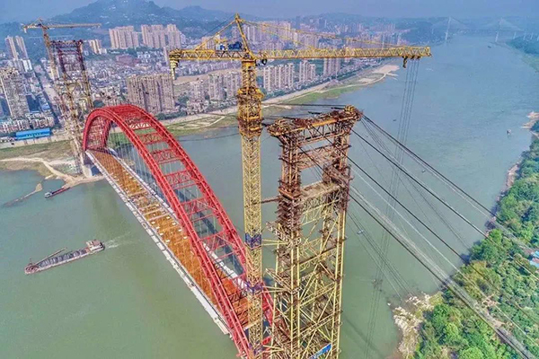 该桥为世界主跨跨径最大的飞燕式钢管混凝土系杆拱桥,全长1420米,主跨507米,采用2×170吨缆索起重机安装,2019年7月3日合拢。