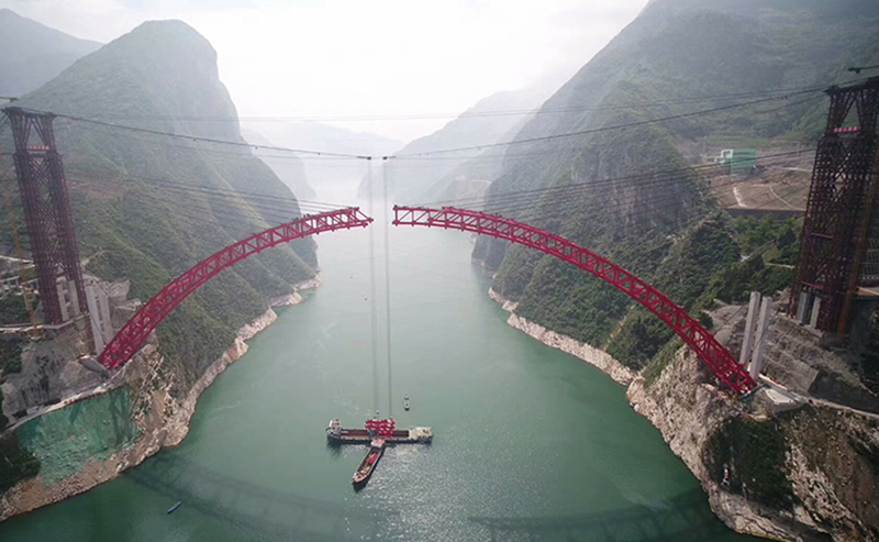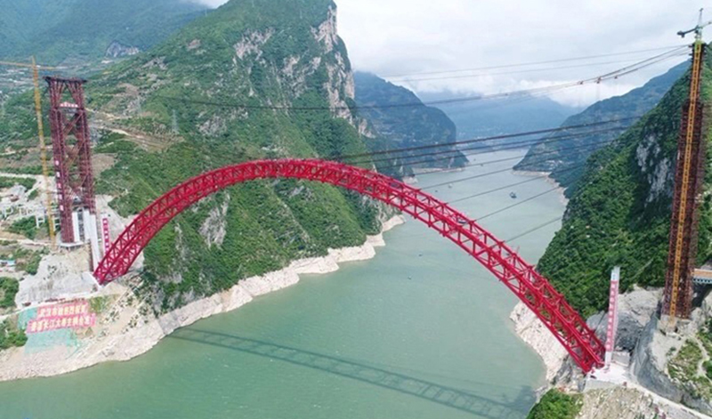 秭归长江大桥为中承式钢箱桁架拱桥,主跨531.2米,全长883.2米,采用2×200吨缆索起重机安装,2018年5月22日主拱合龙。