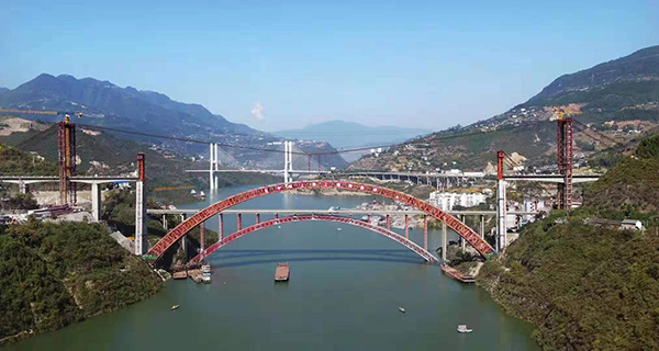 该桥为上承式提篮拱桥,主跨340米,采用2×75吨缆索起重机安装,2019年10月29日主拱合龙。