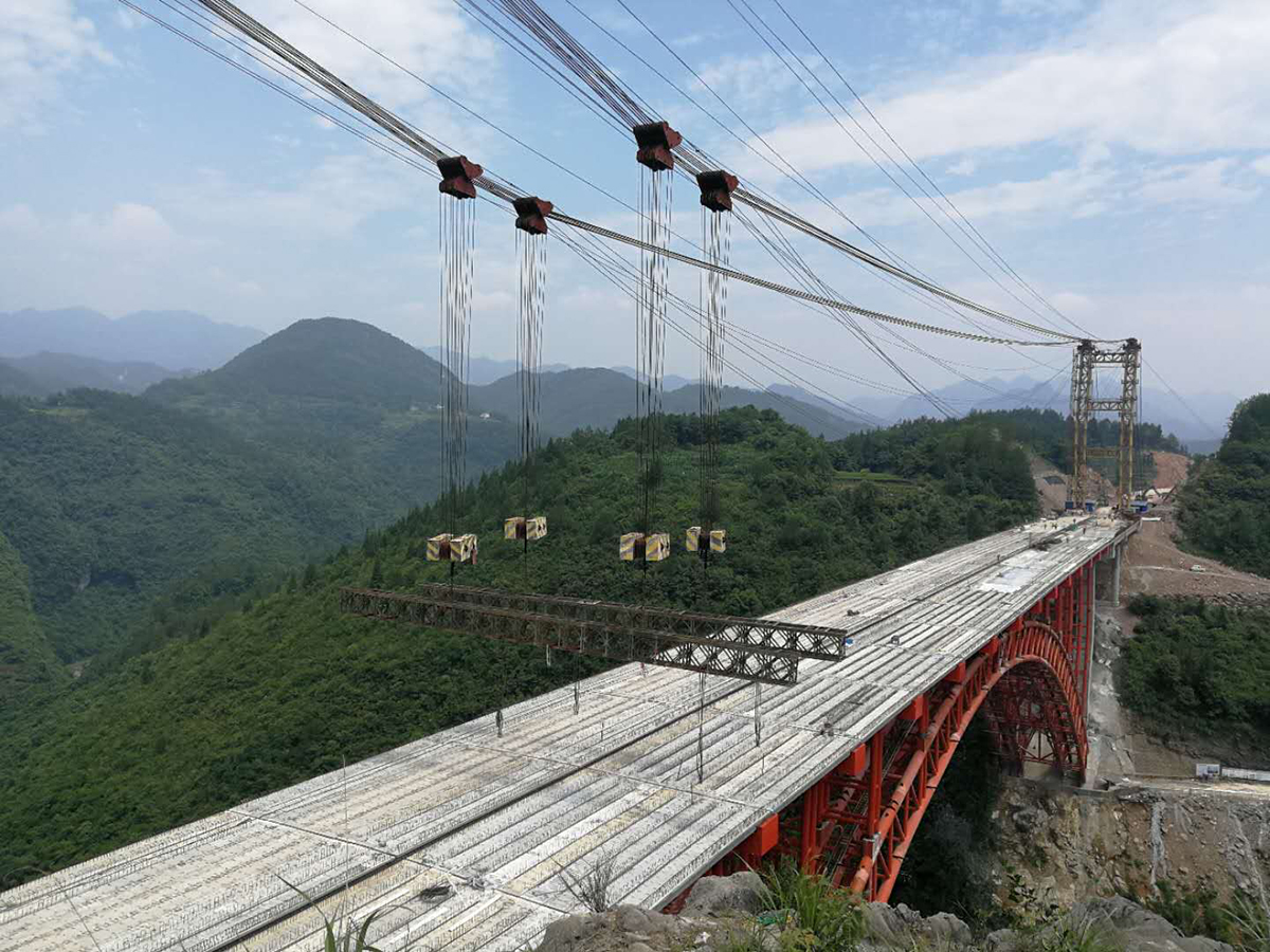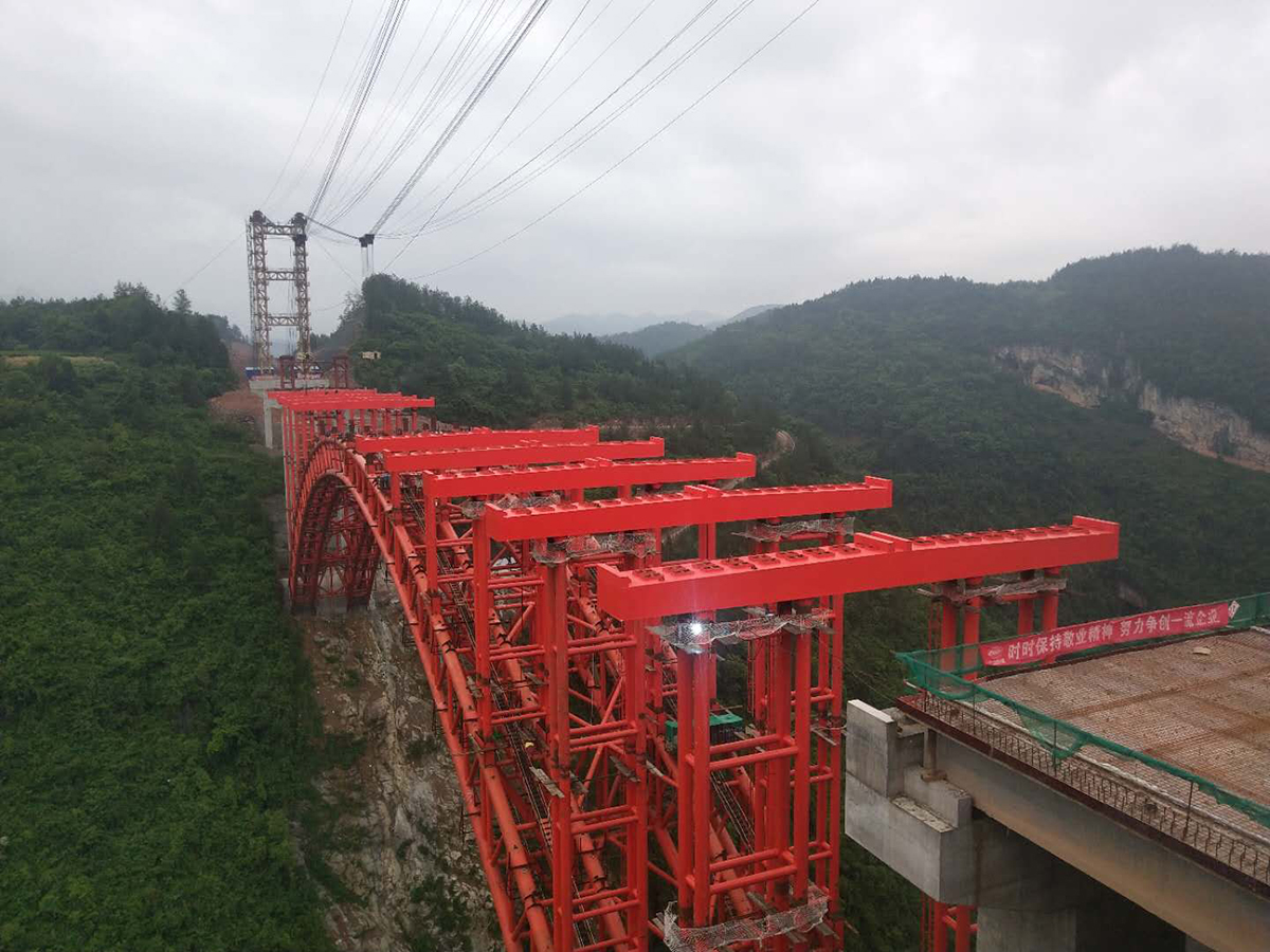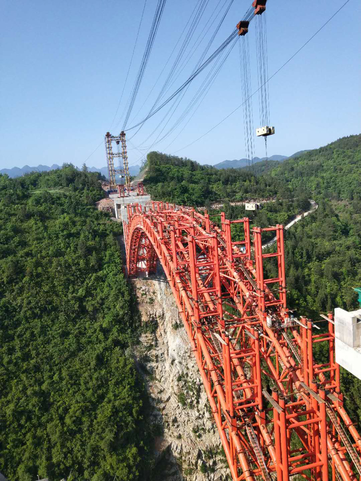 该桥为上承式钢管混凝土拱桥,主跨225米,采用2×50t缆索起重机安装,主拱于2018年10月28日合龙。