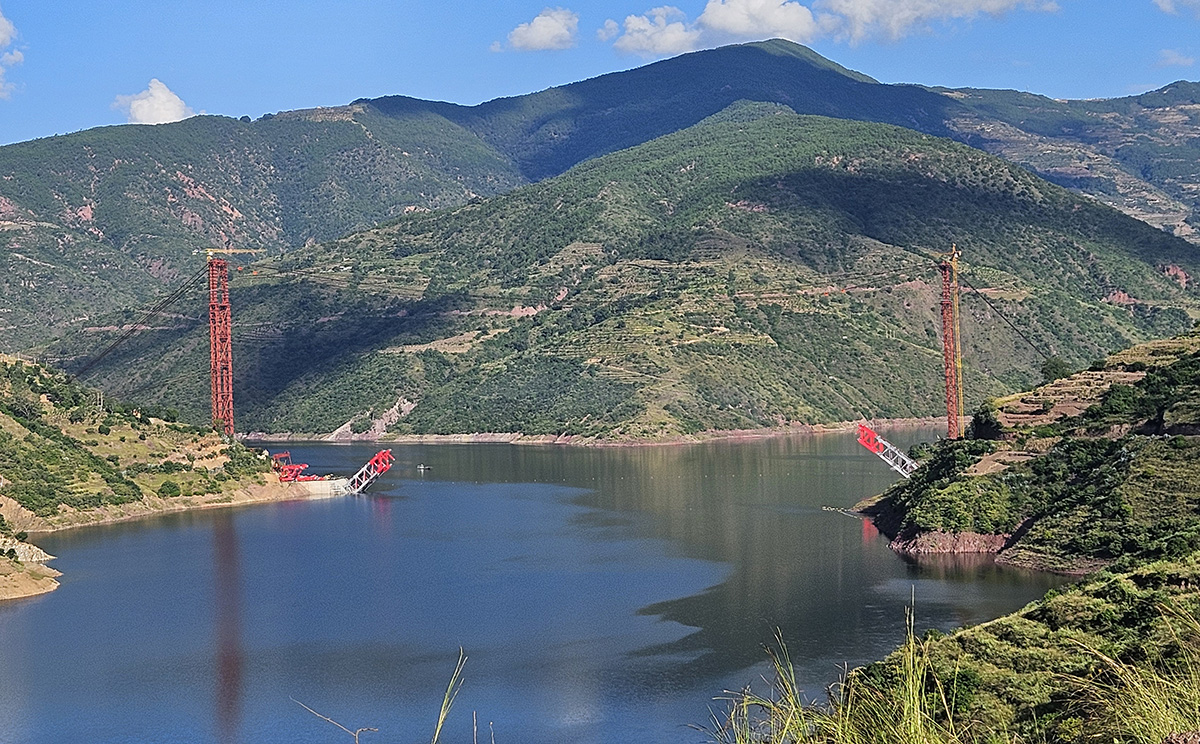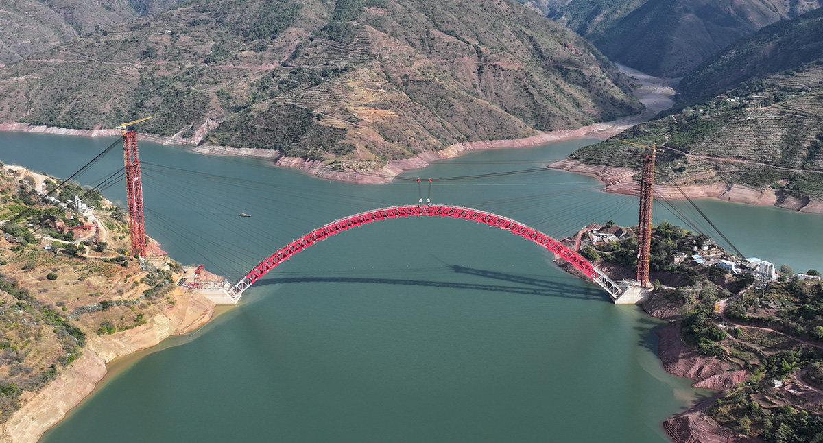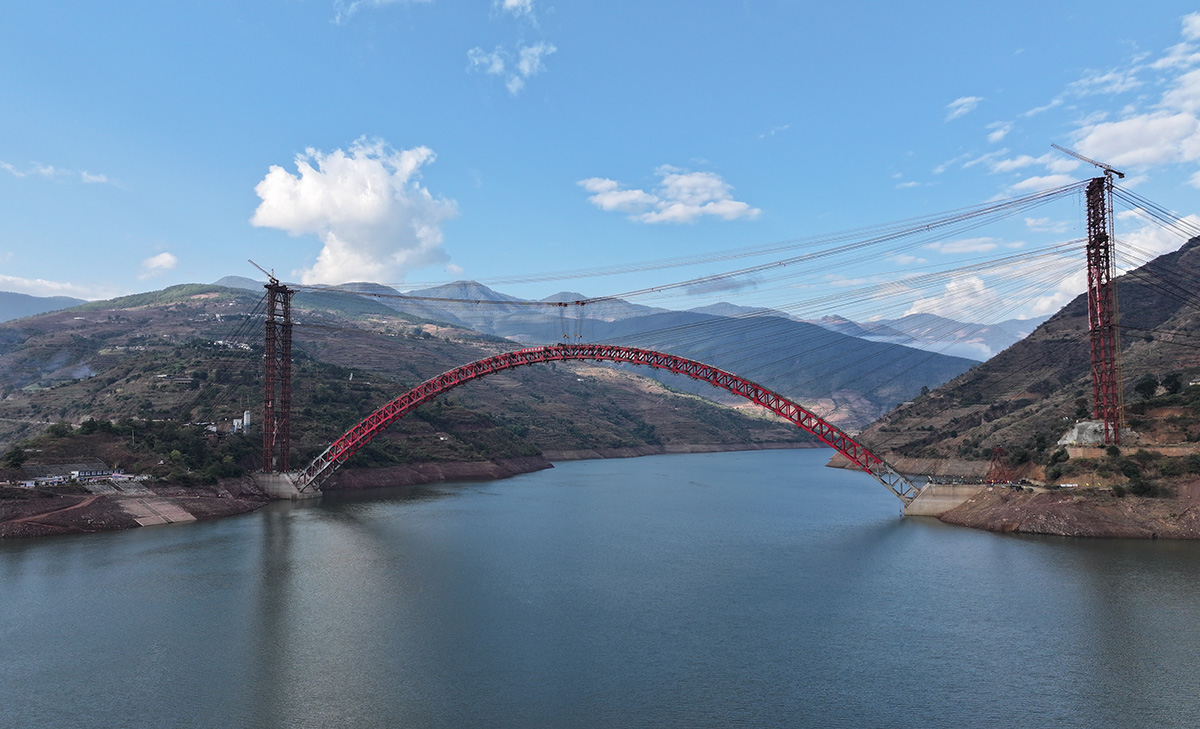 该桥为主跨390米的中承式钢桁架提篮拱桥,全长546米,采用160t缆索起重机进行安装,2025年1月3日合龙。