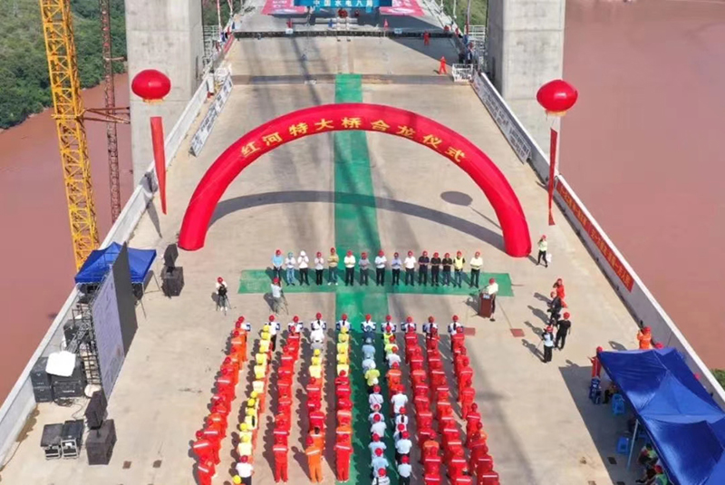 红河全长1280公里,是一条跨越中国和越南的国际河流。红河特大桥为跨越红河南沙水库而建,是我国首座跨越红河的高速公路悬索特大桥,大桥全长1366米,其中建水岸引桥长580米,元阳岸引桥长80米,主跨长700米。库区水面距桥面高达184米,建水侧主塔高181.29米,元阳侧主塔高122.5米。2020年9月5日,红河特大桥主跨成功合龙,标志着全线工程建设取得重大节点性胜利。