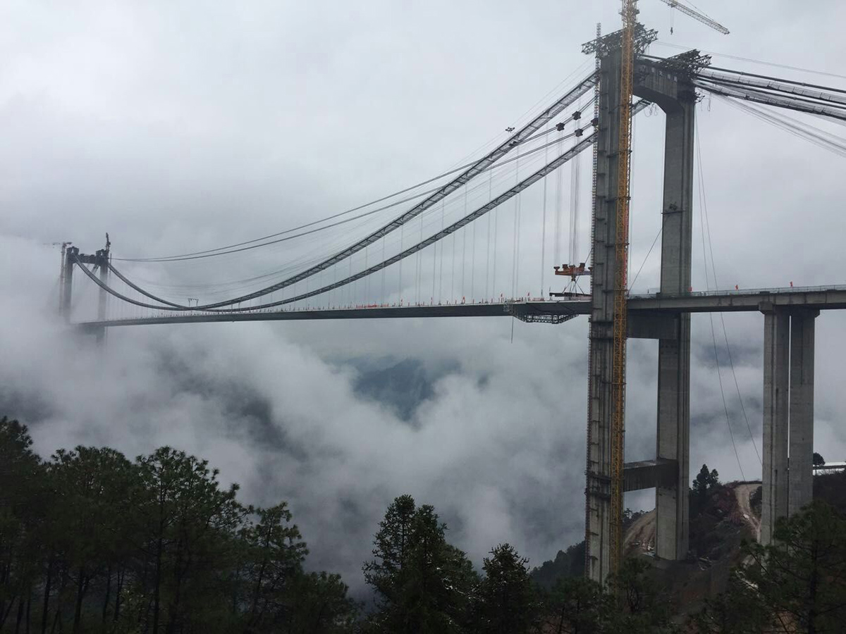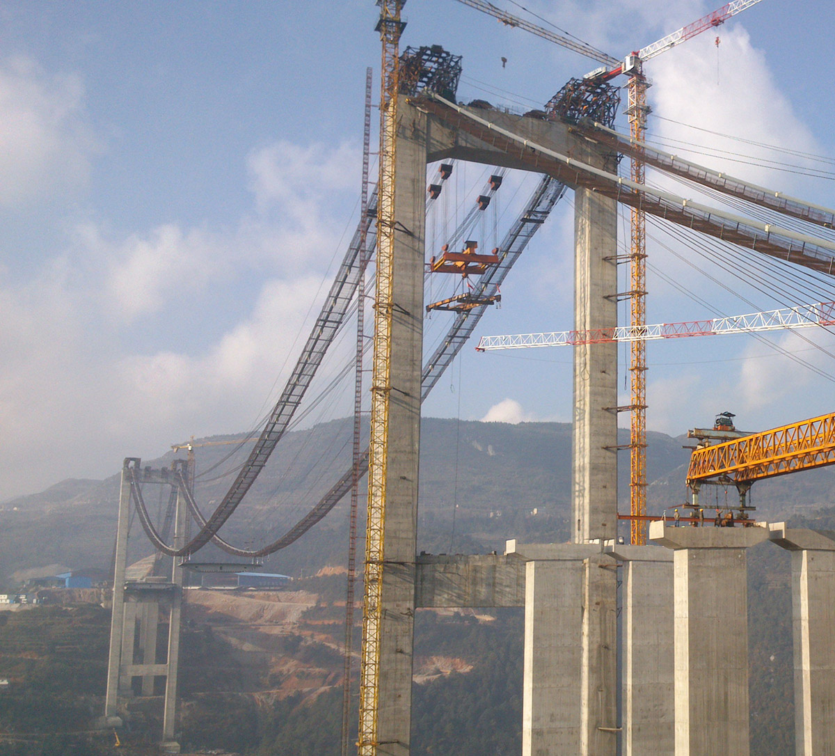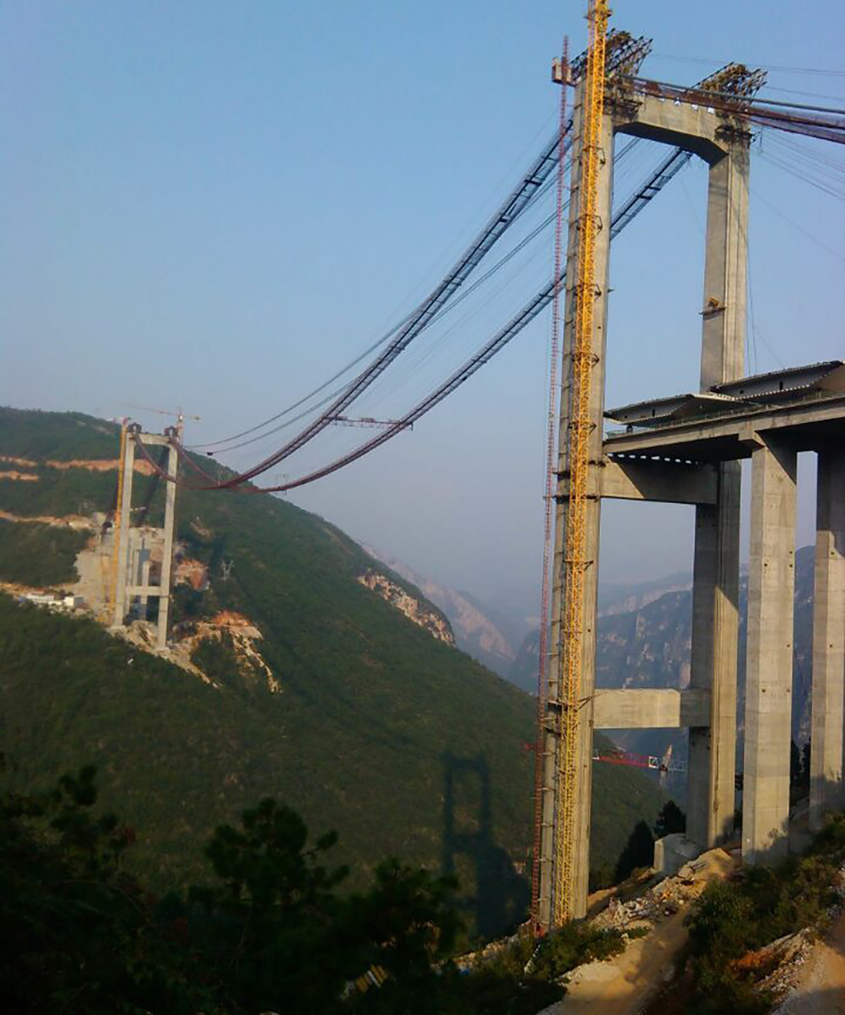 普宣高速普立特大桥,桥长1290米,主桥628米,为双塔单跨钢箱梁悬索桥。该桥采用250吨缆索起重机进行钢梁架设,并首次应用公司研发的旋转吊钩对构件空中姿态进行自由调整,为山区悬索桥开辟了新的钢梁架设方法。