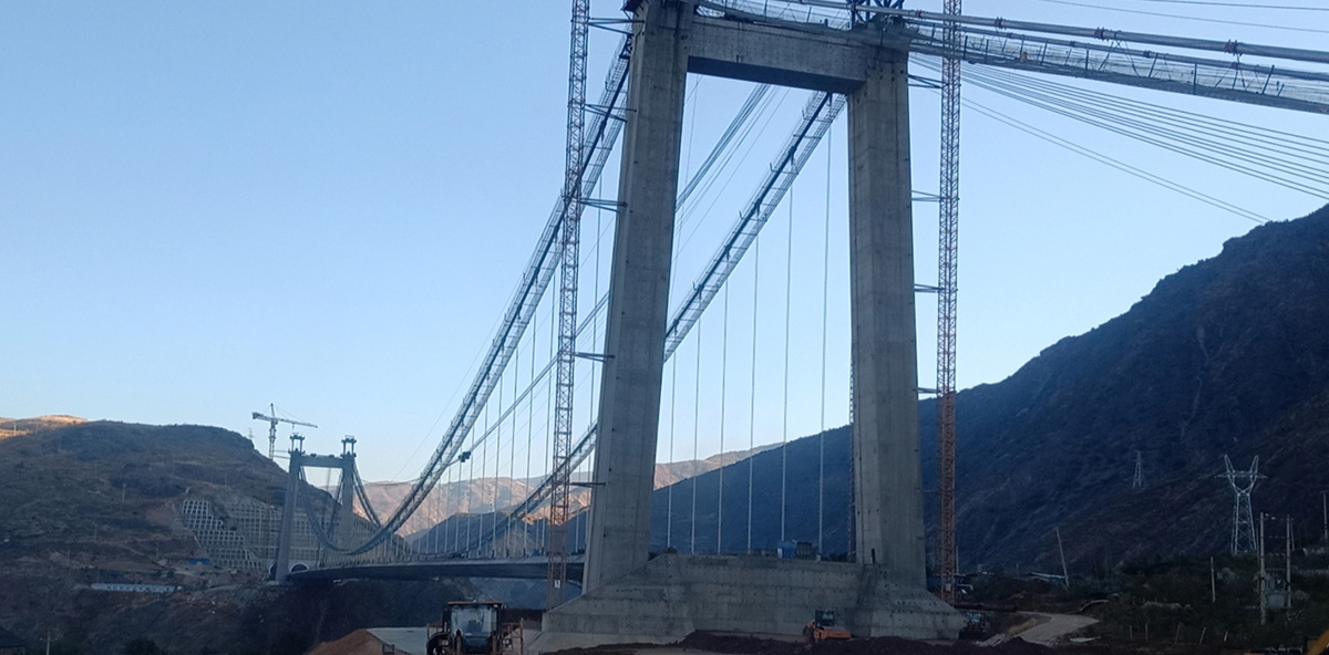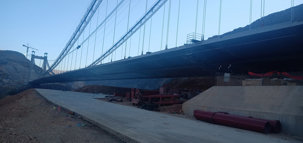 该桥为单跨钢箱梁悬索桥,主跨636米,采用2×85t缆索起重机安装,2019年12月31日合龙。